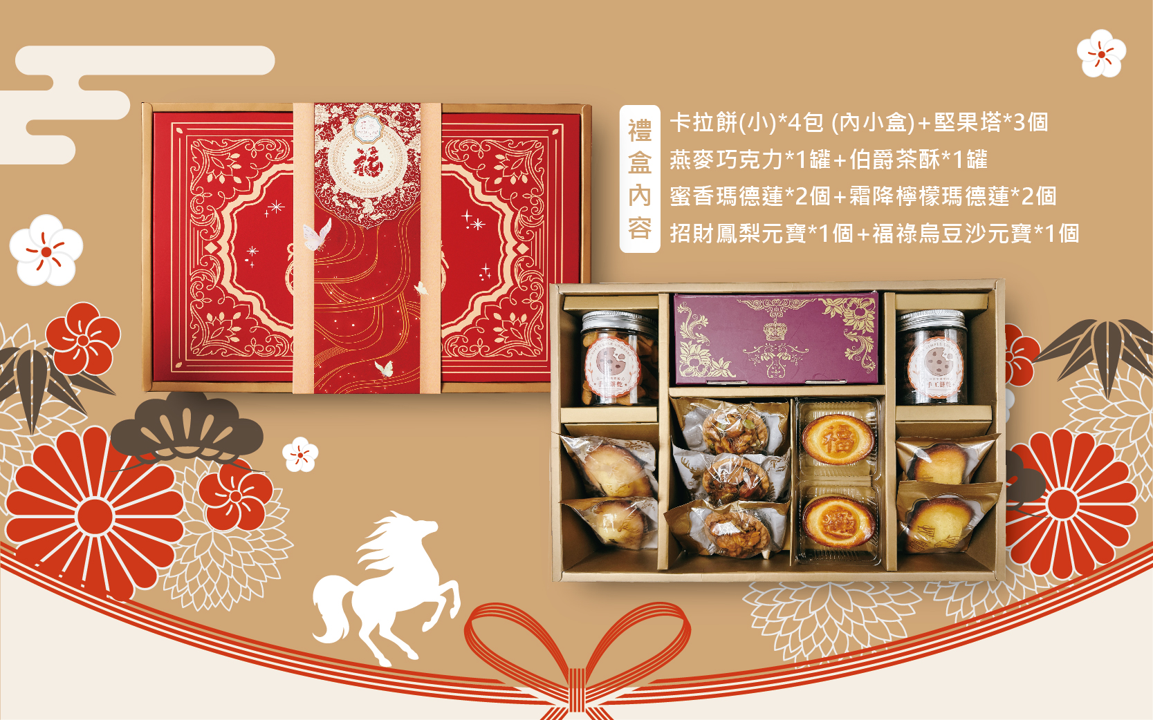 內容:巧克力燕麥罐裝*1罐+伯爵茶酥罐裝*1罐+卡拉餅(小包)*4包【內小盒】+蜜香瑪德蓮*2個+霜降檸檬瑪德蓮*2個+堅果塔*3個+鳳梨招財元寶*1個+烏豆沙福元寶*1個