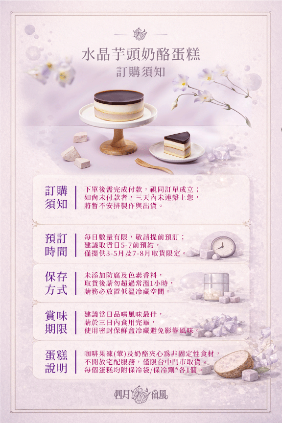 【水晶芋頭奶酪蛋糕】為當日新鮮製作,賞味期限極短,保存條件嚴格,請於您指定的日期至門市取貨,以確保風味與品質。